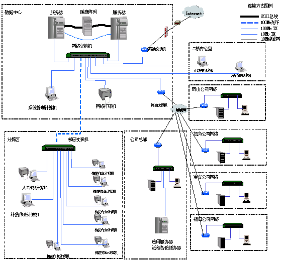 4、5、深圳市烟草公司卷烟供应链配送系统配置 4、5、1数据库及应用服务器系统 物流配送系统数据量大,实时性要求很高,针对深圳市烟草公司物流配送体系的业务需求,采用Oracle公司开发的Oralce9i数据库系统和ApplicationServer9i应用服务器软件系统。 4、5、2、网络系统 深圳市烟草公司物流配送系统覆盖全市共11家公司及物流配送中心,地点分散,各公司与物流中心,上级公司与下级公司间数据交换量很大,因此系统设计采用了IP城域网的方式,各公司通过10M的带宽连接至数据中心,所有公司共享一个主数据库服务系统,大大提高了系统性能和维护成本,提高了数据交还的实时性;公司内部局域网选择1000M快速交换以太网的方式,建立了企业主干通讯网络系统,通过冗余光纤构成双环状的企业网络的核心。 系统主机及网络平台示意图如下: