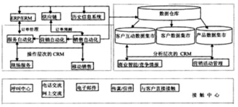 (一)CRM简述: CRM(CustomerRelationshipManagement客户关系管理)CRM是一种旨在改善企业与客户之间关系的新型管理机制,它实施于企业的市场营销、销售、服务与技术支持等与客户相关的领域。CRM的目标是一方面通过提供更快速和周到的优质服务吸引和保持更多的客户,另一方面通过对业务流程的全面管理来降低企业的成本。CRM既是一种概念,也是一套管理软件和技术,利用CRM系统,企业能搜集、跟踪和分析每一个客户的信息,从而知道什么样的客户需要什么东西,真正作到1:1,同时还能观察和分析客户行为对企业收益的影响,使企业与客户的关系及企业利润得到最优化。下图可以代表当前人们对CRM的主流认识。