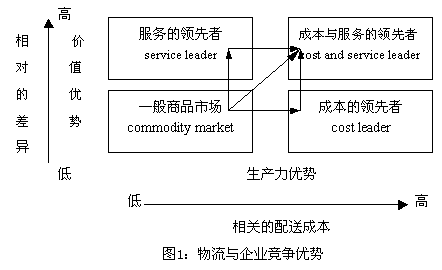 成本项目包含物流运作的单位成本、运输费用、仓储费用、逆向物流费用、物流管理费以及成本占营业额的比例;运用ABC②分析物流中心成本结构及影响成本的活动因素,并建立其关联性,藉此作为评价第三方物流服务供应商的一个主要指标。现代企业的竞争力除了需具备传统的研发能力、产品功能和营销技巧外,企业的竞争优势主要取决于成本与服务品质,如图1所示,哪个企业能成为成本与服务的领先者,哪个企业就具有最大的竞争优势。