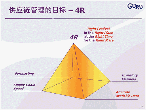 我们来看一下供应链管理面临的挑战。其中,最主要的是有四个R,即RightProduct——正确的产品、RightPlace——正确的地点、RightTime——正确的时间、RightPrice——正确的价格,它们就是供应链管理要达到的目标(见图3)。美国曾经做过一个统计,有1/3的人到商场却买不到想要的东西,因为很多厂商所生产的产品,实际上并不是客户需要的。