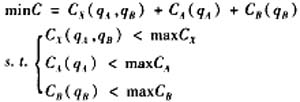 在上述模型中,CX、CA、CB分别是主生产厂商X和零部件供应商A、B与批量有关的成本函数,maxCX、maxCA、maxCB分别是主生产厂商X、零部件供应商A和B可承受的与批量有关的最大成本。