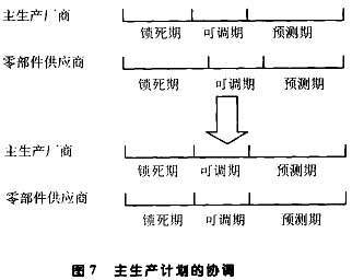 K.van Donselaar、J.van den Nieuwenhof、J.Visschers指出,由于多个传统的MRP系统没有进行很好的接合,因此在一些行业中,MRP系统在厂商之间的物料计划合作上是大大逊色于LRP系统的,而LRP系统的本质就是最终客户需求的变化信息能够很快传递到供应链的每个节点企业。可以想象,如果能把主生产厂商的MRP系统和零部件供应商的MRP系统在二层供应链上很好的接合起来,共享需求和生产信息,协调好各自的主生产计划,这将会在很大程度上提高供应链的运作效率。主生产计划的协调可用图7表示。