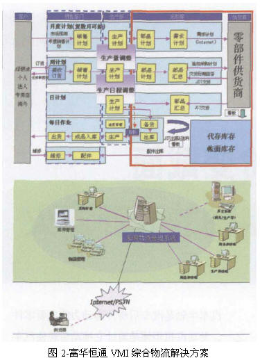 富华恒通VMI综合物流解决方案在汽车行业中的实际应用之一在Z公司。Z公司是中国某汽车制造公司,主要业务为生产商用汽车,他要求北京富士通提供的系统需具备:供货商管理功能-将采购计划、供货商的当前库存、安全库存等在Internet上公布,以供供货商查询的功能;入库、出库、零部件上线、生产线在制品的库存管理等全部的厂内零部件物流管理功能;在进货、出库、退货、盘点时使用HHT(Hand-Held Terminal)进行业务处理的功能;根据生产日计划自动生成零部件上线发料单的功能;根据看板送零部件进车间的功能;根据实际上线的数据与供货商进行结算的功能。