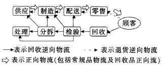 "逆向物流"这个名词最旱是由Stock在1992年给美国物流管理协会(CLM)的一份报告中提出的,CLM对逆向物流的定义为:"计划、实施和控制原料、半成品库存、制成品和相关信息,高效和经济地实现从消费点到起点的过程,从而达到回收价值和适当处置的目的。"更简单的概括为,逆向物流管理是对货物、服务及相关信息从消费地到起源地的有效流动和储存进行计划、执行和控制,以满足再创造价值或适当处置的过程。尽管逆向物流主要是指物资的逆向流动,但同时又伴随着信息流、资金流,它与常规物流(正向物流)无缝对接而使整个物流系统成为一个闭环。逆向物流包括退货逆向物流和回收逆向物流两部分。退货逆向物流是指下游顾客将不符合订单要求的产品退回给上游供应商,其流程与常规产品流正好相反;回收逆向物流是指将最终顾客所持有的废旧物品回收到供应链上的各节点企业。具体流程见图1逆向物流网络示意图。