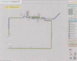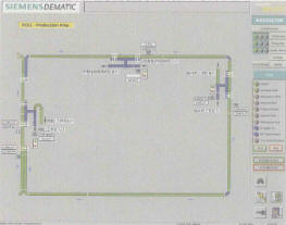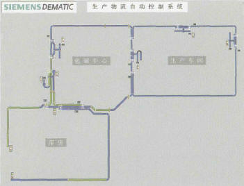 物流自动控制系统主要是控制输送系统完成其物料的输送任务。在环绕库房、生产车间和包装车间的场地,距地面4至6米处,设置有由许多皮带输送机、滚轮输送机等组成的一条条输送链,经首尾连接形成连续的空中输送线。在物料的入口处和出口处设有和路径叉口装置、升降机和地面输送线。这样在库房、生产车间和包装车间范围内形成了一个既可顺畅到达各个生产位置同时又是封闭的循环输送线系统。所有生产过程中使用的有关材料、零件、部件和成品的等物料,都须装在贴有条形码的托盘箱里才能进入输送线系统。在生产管理系统发出的生产指令的作用下,装有物料的托盘箱从指定的入口处进入输送系统。