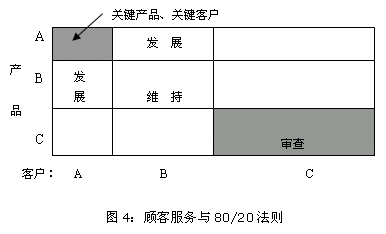 象限2:提供高度便利性 位于这一象限区的产品需求频繁而且具有较高的获利能力,例如当前市场上的部分29”、34”彩电产品。对于这类产品,我们应该提供高水平的服务,使它们存储地点尽可能靠近客户(顾客)或实行快速配送战略,使物流服务具有高度便利性。 图3:产品服务水平矩阵 象限3:审查产品存在必要性 位于这一象限区的产品对利润没有贡献(或者说贡献很小),就销量来说,很少变动。公司应该定期对此类产品进行评估,看能否从产品系列中删除,例如当前市场上的部分21”彩电产品。除非它们在企业产品组合中扮演战略性角色,否则公司应该放弃。 象限4:准时制配送 位于这一象限区的产品获利能力高但销售速度相对缓慢,适合实施准时制配送。也就是说应该将它们集中存放,尽可能靠近供应链后部,以减少库存总投资,然后直接快速地运输到顾客(客户)手中。例如当前市场上的数字高清彩电产品等等。 这种按照产品划分服务优先次序的方法可以扩展应用到A公司客户(顾客)的服务优先次序中。图4表明如果80/20法则既适应于产品有适应于客户(顾客),那么所有的业务实际上就依赖于购买少数高价值产品的少数客户:20%的客户购买20%的产品=4%的所有客户/产品交易提供了80%利润的80%=64%。换句话说,仅4%的业务(以客户订单计量)创造了所有利润的64%。  图4:顾客服务与80/20法则 基于这一事实,第一点显然是把最高水平的服务和便利性提供给订购关键产品的关键客户(顾客)。在另一极端,我们应该不断地审查低盈利能力的客户(顾客)和产品。在这两者之间的范围内,以产品对客户(顾客)之“关键价值”为基础,并参照产品的获利性等级进行服务优先次序的调整。例如: 对利润贡献度不同的分公司、客户设定不同的信用额度等级范围标准,优先保证重要分公司、客户订货需求。 对图3象限区1、3内的产品规定一定的物流配送限制条件(如最小订货批量),而对于象限区2、4内的高端产品不限配送量,424小时内快速响应客户需求等。 24小时响应客户售后服务需求。 重要客户订单完成率应大于90%。
