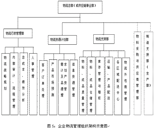 3、物流组织结构重组 规划成立公司专门的物流部门,集中负责公司采购、生产、销售等物流管理的计划、执行、监督和管理控制活动,在物流部门内建立物流信息中心和成本核算中心,从计划、预测、技术、成本等方面为公司领导提供参谋和建议,如图5所示。 结合A公司的现实情况,为减少风险,降低企业组织变动成本,我们建议公司物流组织的再造分阶段逐步实施。 第一阶段:针对销售物流业务,在销售公司现有运输部的基础上组建物流部,物流部隶属销售公司。 第二阶段:组建公司物流支持部,物流业务作业与协调统一由物流支持部负责,产品资源计划与分配统一由销售公司负责。 第三阶段:成立公司物流总部或供应链管理事业部,集中负责公司采购、生产、销售等物流管理的计划、执行、控制活动。  4、商物分流,实行商流和物流的专业化管理 在A公司,2001年以前的产品销售流通过程中,几乎全部采取商流和物流管理合一的方式,即销售公司各分公司、经营部、办事处既负责产品的促销、客户订货、产品价格管理、市场推广、客户关系管理等与商品交易有相关的商流业务,又负责仓储、存货管理、物品装卸、搬运、货物配送等与实物库存、移动有关的物流业务,这在企业产品品种单一、经营渠道单一和信息化水平不高的条件下是有一定道理的。然而,随着公司产品品种多样化、销售渠道多元化趋势的发展和信息系统建设的逐步完善,这种管理模式将越来越不适应社会专业化大分工和市场竞争发展的需要。由于商物合一,仓库随销售业务层层设立,也导致公司物流成本居高不下、库存管理混乱、存货积压严重,同时销售费用和物流费用不易区分,也不利于各部门专业化水平的提高。 实现商物分离,就是将物流从销售商流中剥离出来,改变原来公司管理只重商而不重物的状况,销售部门将专门负责与商品交易有关的业务活动,如市场预测与计划、客户订货管理、合同管理、市场促销与策划、售后服务等。而将存货库存管理、仓储管理、产品配送与转移等具体的物流作业和管理业务活动交给专门的物流机构负责。例如:公司物流总部、第三方物流管理公司等。