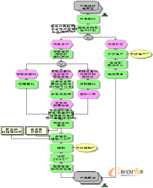 Zara为这些工厂提供了一系列容易执行的指令,一般一段时间一个工厂集中做一款服装以减少差错。其运作模式达到成组单元的效果,因此在其它公司需要几个月时间的工作Zara在几天之内就能完成。在Zara总部拉科鲁尼亚附近约有500家这样的外协缝制厂,他们几乎专为Zara公司工作,Zara公司密切监督他们的工作流程以保证产品的质量。外协缝制厂把衣服缝制好之后,再送回Zara做慰烫、贴标签和包装等最后处理并接受检查,然后送到物流配送中心。(见采购与生产的整体流程图)