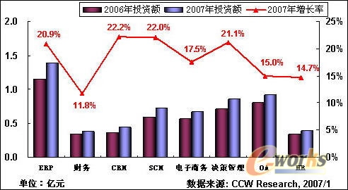 计世资讯(CCWResearch)预测:虽然2007年制药行业的整体利润率虽然会继续下滑,但制药企业希望通过加大IT投入力度以实现管理创新和经营模式创新。对信息化的投入不降反升,2007年中国制药行业信息化投资将开始进入一个新的增长阶段。2007年中国制药行业IT投资额将达到13.70亿元,同比增长率将达到20.3%。