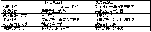 所谓敏捷供应链,是指以核心企业为中心,通过对资金流、物流、信息流的控制,将供应商、制造商、分销商、零售商及最终消费者用户整合到一个统一的、无缝化程度较高的功能网络链条,以形成一个极具竞争力的战略联盟。敏捷性是美国学者于1990年代初提出的一种新型战略思想,当时提出这种战略思想主要是针对制造技术领域,目标是提高制造系统对外部环境变化的应变能力。我们认为:在竞争日趋激烈、市场需求更为复杂多变的网络时代,有必要将敏捷化思想运用于整条供应链管理,其实质是在优化整合企业内外资源的思想上,更多地强调了供应链在响应多样化客户需求方面的速度目标。同原来的一体化供应链观念相比,敏捷供应链有着显著不同的内涵。 1、战略目标:传统管理思想的灵魂是高成本、低效率,而这一思想的理论假设是认为消费者偏好更多地倾向于价格和制造质量。一体化供应链管理没有摆脱传统企业管理思想的束缚,质量和价格依然是其主要战略目标,敏捷供应链观念则顺应时代潮流,将战略目标定位于对多样化客户需求的瞬时响应。 2、资源观念:一体化供应链管理也强调对资源的充分利用和挖掘,但是其资源观点局限于企业内部,敏捷供应链从扩大的生产概念出发,将企业的生产活动进行前伸和后延,把上游的供应商和下游的客户纳入企业的战略规划之中,实现对企业内外资源的最佳配置。 3、供应链驱动方式:依赖传统生产组织方式是很难真正实现以需定产的,因为缺乏即时按单生产的能力,一体化供应链管理只能按照从供应到生产再到销售的推动生产方式进行,结果造成各个环节大量库存的堆积。敏捷供应链在敏捷制造技术、信息技术(IT)及并行工程技术(OE)的支持下,成功地实现了客户需要什么就生产什么的订单驱动生产组织方式,降低了整条供应链的库存量。 4、组织机构构建:新战略依赖新型组织机构,敏捷供应链的成功实施依赖于虚拟组织的构建,即:若干相互关联的厂商,基于战略一致性而构成的动态联盟。与传统的实体组织相比,虚拟组织具有如下几个特点:(1)超组织性,它不一定是一个独立的法人实体,而是为了特定目标或项目由相关结点企业形成的联盟;(2)动态性,虚拟组织不是一成不变的,当市场需求或组织目标发生变化时,原先的组织即刻解体;(3)网状组织,它改变了传统的等级分明的金字塔结构,允许信息横向传递与交流,使信息利用更为充分及时。 5、与结点企业的关系:一体化供应链观念没有超越企业的边界,依旧把供应商看成讨价还价的利益博弈对手,把客户看成服务对象,敏捷供应链突破以往框架,重新定位与上下游节点企业的关系,与供应商结成利益一致的合作伙伴,客户则被看成是企业能够创造价值、使产品增值的重要资源。 为求简洁直观,将以上观点列于下表1。