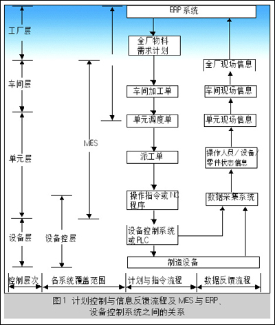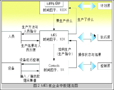 图1 计划控制与信息反馈流程及MES与ERP、设备控制系统之间的关系 在MRP II、ERP系统产生的长期计划的指导下,MES根据底层控制系统采集的与生产有关的实时数据,进行短期生产作业的计划调度、监控、资源配置和生产过程的优化等工作。图2描述了MES在企业中的数据流图。