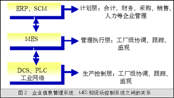 图2 企业信息管理系统、MES和现场控制系统之间的关系 一个企业的良性运营是使“计划”与“生产”密切“配合”,在最短的时间内掌握生产现场的变化,是保证计划合理而快速修正的关键。为此,企业的计划层与生产控制层之间需要“直通车”,使计划与生产现场可以实时互动。 然而目前企业中从ERP中得出的生产计划与生产现场之间的信息传递,是依赖“手工作业”的,即人工将生产现场的信息输入到上层系统中。因此,在计划层和生产现场的过程控制层之间,存在一个信息流通上的断层。 市场环境的变化和现代生产管理理念的不断更新,开始越来越迫切地要求 “消除断层”,即需要一种可以由下而上实时掌握生产现场状况的信息管理系统。具体体现为以下几个方面: