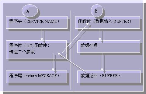 其中(A): 程序头和程序尾和程序体,每个程序是类似的,是控制体,而(B)为业务部分,利用TUXEDO的参数体(FML buffer)来动态传递参数,复合构件并没有直接对应的实现体,其定义部分除了包含对外提供的功能和要求的功能外,还包括了其内部成员构件之间的连接,以及复合构件和成员构件之间的映射关系。