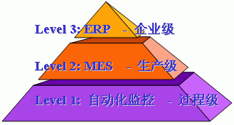 MES是美国管理界90年代提出的新概念。美国先进制造研究机构AMR(Advanced Manufacturing Research)通过对大量企业的调查发现现有的企业生产管理系统普遍由以ERP/MRPII为代表的企业管理软件,以SCADA、HMI(Human Machine Inteface)为代表的生产过程监控软件和以实现操作过程自动化,支持企业全面集成的MES软件群组成。根据调查结果,AMR于1992年提出的三层的企业集成模型(如图1)。