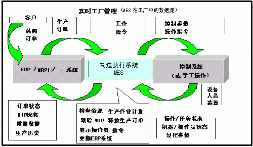 图中左边ERP等系统需随时注意产品库存量、客户订单状况与材料需求,然后将这些信息传送至MES,由执行系统进行生产或安排库存以满足客户订单需求。对MES而言,这一层就是生产的计划层。