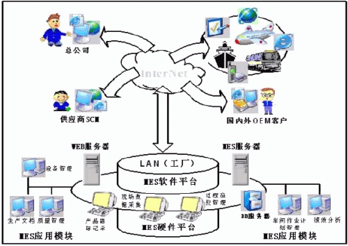 在企业内部,各功能站通过局域网对MES 服务器进行交互操作,同时其他各查询终端也通过局域网查询MES 处理后提供的数据、报表和图形。在企业外部,通过Internet 可以连接到MES,在设定的权限内对系统进行信息发布或读取操作。公司内部管理、外部机构以及其它相关业务单位通过 MES 联系形成了一个紧密的整体,做到实时信息共享,使业务流程变得有序而高效。