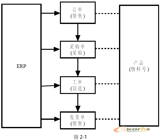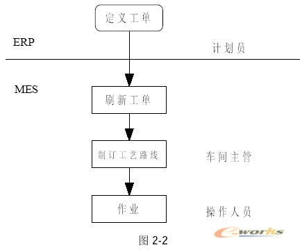 工单又称任务单、计划单。一个工单定义了一次加工作业,包含以下信息:待加工产品、数量、加工起点、原材料输出仓库、成品输入仓库,以及工单状态、计划完成时间等辅助信息。一个标准的MES系统是由工单驱动的。首先由计划员在ERP中定义工单,然后将此工单刷新到MES,车间的主管将工单落实到具体的产品工艺路线,操作人员按照工艺路线进行作业。如图2-2: