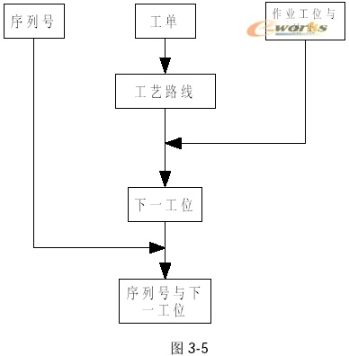 按第二种定义,前台录入工单、序列号、作业工位、结果;后台根据工单得到工艺路线;根据工艺路线、作业工位、结果,得到下一工位;根据序列号、下一工位更新工艺状态。如图3-5所示: