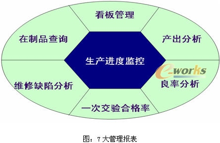 | | 一般可获得的效益: 1)减少因钢板、锡膏、Feeder、物料等使用不当对产品质量的影响 2)批量返修状况的减少,可增加产线的产出量和产品质量的提升,并降低维修的成本 3)提升换料的效率,缩短因换料带来的停机时间 4)可不停线盘点物料的数量和状态,快速评估ECN对物料的影响 5)实时监控物料的耗损,在工单的实际耗料超标前进行及时管控 4.管理报表: 实时产生报表数据库,快速提供生产进度、产量、品质、维修、在制品等状况的监控,为管理层决策提供依据 以生产进度监控为核心,需要提供7大报表的情况,如下图所示:  生产进度监控:监控工单的达成情况,并评估对客户订单是否存在影响。在客户插单进来时,可以帮助评估达交期。 看板管理:实时监控各时段产线的产量,实时监控各产线的直通率的情况,实时监控各产线缺陷分布情况 产出分析:针对机种、产品、工单、工段、产线、工序、设备七大维度,按照不同的时间类型,如时段、班别、天、周、月,分析投入产出的推移情况和不同对象的对比情况,以便追查出问题点和改善方向。如果发现同一产品在2条线生产,而其中一条产线的产出较多地超出另外一条产线,那么分析高效率产线达成的原因就成为重点,找出优秀的地方,然后进行推广。 良率分析:针对机种、产品、工单、工段、产线、工序、设备七大维度,按照不同的时间类型,如时段、班别、天、周、月,分析不良率、直通率和PPM的推移情况和不同对象的对比情况,以便追查出问题点和改善方向。如果发现差异,,那么差异点就成为了分析的重点,找出优秀的地方,然后进行推广。 一次交验合格率:产线的有效产出是否高,主要看的就是一次交验合格率。有效产出指的是可以销售给客户的良品,这些产品才是制造企业可以用于获利的。一次交验合格率低就意味着产线返工的情况要增加,更多的精力用在已有产品的补漏上,而不是新的产品的产出上,这样就会高的成本投入,而只有较低的产出。所以一次校验合格率往往成为品质管控的重点。 维修缺陷分析:依据柏拉图原理快速找出需重点改善的缺陷,并依据缺陷与不良原因,缺陷与解决方案,缺陷与不良位置,缺陷与责任部门的交叉分析,找出有效的改善措施 在制品查询:实时监控产线的在制品情况,帮助找出产线的瓶颈岗位。同时因为有了电子化的在制品数据,在交接班时,可以快速完成数据的交接,缩短交接班的用时,提高生产准备的效率。 5.预警管理: 实时对关键指标进行监控,异常出现时通过Mail、短信、看板等方式进行警示,变被动管理为主动管理 常见的监控的关键指标有: 1)Cpk指标:单一机种在每日生产过程中同一生产线之各单项量测值之Cpk值是否低于标准 2)不良零件指标:单一机种在每日生产过程中同一生产线所产生的零件不良数是否超过标准 3)缺陷指标:单一机种在每日生产过程中同一生产线﹐同一站所产生的同一不良现象次数是否超过标准 4)直通率指标:单一机种在每日生产过程中直通率是否低于标准 6.SPC: 针对测试数据,进行制程稳定性的分析,以便在制程能力降低时及时进行处理,保证产品在出现批量不良前,得到有效控制。 对于网络设备产品来说,往往有些测试项的量测值较容易出现漂移,如何在出现异常趋势时,就能及时地进行控制,将是减少批量性不良的有效措施。对于其他对产品电子功能指标要求严格的产品,同样会遇到上述的问题。 在企业里,往往这些有用的数据都存放在各个测试设备上,成为孤立的数据存在着,没能发挥出对产品品质改善的帮助作用,实在是可惜。 雅新电子应飞利浦客户的要求,在2004年完成MES的成功上线,除eSMT功能,已完全实施了MES的各大功能,由于生产管理能力的提升、品质改善以及成本的降低,在MES上线3个月后,飞利浦释放出3倍的订单交给雅新。MES为雅新带来订单效益和生产管理能力提升的双重效益。 MES作为当今有效降低成本,提升企业竞争力的便捷工具,已越来越得到众多企业的认可,但目前的应用状况,确实又不容乐观,因而企业需认清自身的需求,比对MES的功能组成,找出差异,做好规划,将MES应用迈入正常的轨道。