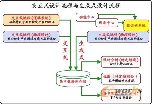 交互式设计流程:在这种设计流程中,设计工程师通过图形化或者表格方式的设计工具手工创建数据并且存储到数据库之中。这是最常见的方式,因为这种方式协助实现设计活动、以及从仿真或者分析获得反馈的可视化实现,从而提供设计决策的依据和支持