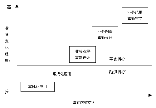 从模式1到模式2是一个自然发展的渐进过程,一般发生在开始应用IT的一段时间之后。遗憾的是,这一阶段的收益也无疑是一个缓慢过程,企业一般没有充分发挥IT手段的潜能。应用模式3、4、5则发生了革命性的变化,这些应用模式不是从现有的工作方式开始应用IT,而是注重对人们已习惯的原有工作方式与工作流程进行重新改造与设计,然后发挥IT手段支持新的工作方式的能力。改造过程愈深,改造范围愈广,收益也就愈大