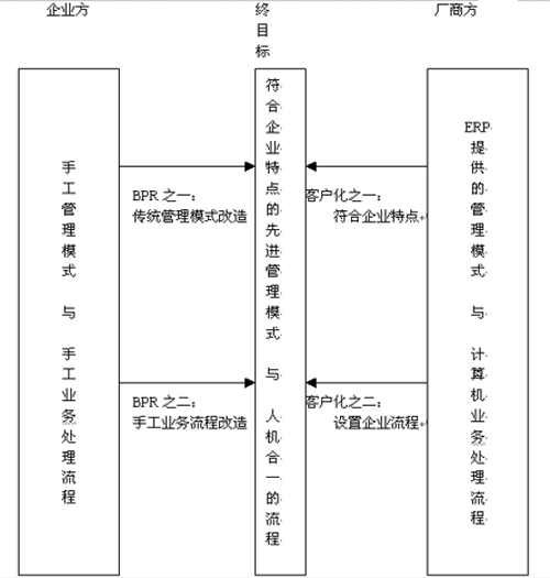 第一,企业在手工管理方式下的管理模式一定不是最先进的管理模式,在应用现代化计算机手段后需要考虑计算机化管理的特点对传统的管理模式进行改造。这就是ERP实施过程进行业务流程重组的内容之一。另一方面,任何一个ERP系统内含的先进管理模式也未必完全符合特定企业的管理要求,因此需要考虑行业背景与行业管理模式对软件功能作适当调整,以适应特定企业管理上的特殊要求(不包括落后的管理要求),这就是ERP实施过程客户化工作的内容之一。从两个方面的改造与调整最终建立企业先进的管理模式。