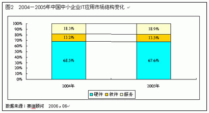 在投资结构方面,开始呈现“软化”的趋势,软件和信息服务的比例在缓慢提升。虽然2005年硬件投入仍占据67.6%的大比例,但其增长速度却低于整体市场增长速度;相反,软件和服务同比增长却超过了市场整体速度,IT服务增长更为明显,达到20.8%。