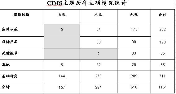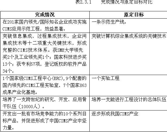 在全部1161个项目中,有1140项完成了按合同的规定任务和要求,同时根据滚动支持的原则,通过中期检查,中止21项。通过严格的项目管理,保证了项目完成的质量。通过这些项目的完成,cims主题超额完成了原定的2000年战略目标。表2.3.1为预期目标与完成情况的简单对比。