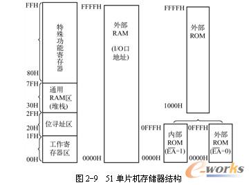 按照物理空间的不同,51单片机的存储器可分为片内RAM、片内ROM、片外RAM和片外ROM 4部分。其结构如图2-9所示。