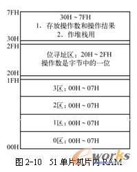 51单片机片内RAM用于暂存数据和运算的中间结果。其存储容量为128B,地址范围为00H~7FH,可分成3部分,00H~1FH是工作寄存器区;20H~2FH是位寻址区;30H~7FH是通用数据缓冲区,如图2-10所示。