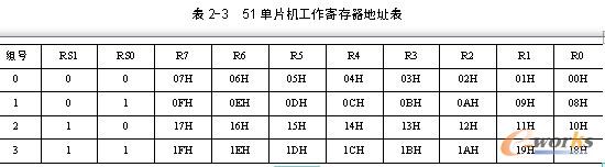 寄存器常用于存放操作数和中间结果。提到“寄存”这两个字时,有人可能会想到超市的“寄存密码箱”,寄存器的作用类似寄存密码箱,它将不用的数据暂时存放。表2-3所示的片内RAM工作寄存器的地址为00H~1FH,分4组,组号依次为0,1,2,3,每组有8个单元,各组都可用R0~R7作为单元的编号。这4组不是同时有效,可以相互切换,由PSW中的RS0、RS1决定,选中的一组称当前寄存器组。为什么要把内部RAM的最低地址部分留给工作寄存器呢?因为它为微处理器提供了就近存取的便利,有利于提高单片机的处理速度,因此,在51单片机指令中使用工作寄存器的情况特别多,且多为单字节指令,执行速度最快。