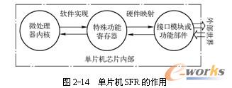 单片机的工作就是用一条条的指令指挥各部分硬件的动作,而这种“指挥”就是通过给特殊功能寄存器填写相应的内容来实现的。不妨将单片机画成如图2-14所示的形式,微处理器内核与特殊功能寄存器之间存在着灵活的“软件上的对应”关系,而特殊功能寄存器与接口模块或功能部件之间存在着固定的“硬件上的映射”关系。特殊功能寄存器在中间扮演着桥梁或者界面的角色。各个接口模块从外部世界采集的现场信息,经过硬件电路立即反映到与自己对应的特殊功能寄存器单元上,微处理器通过执行指令从该寄存器单元里获取相应的信息。相反,微处理器通过填写与某一接口模块对应的特殊功能寄存器单元,由该寄存器单元经过硬件电路将控制信息映射到外围模块上,再由外围模块驱动外接电路完成相应的动作,从而将微处理器的命令落到实处。