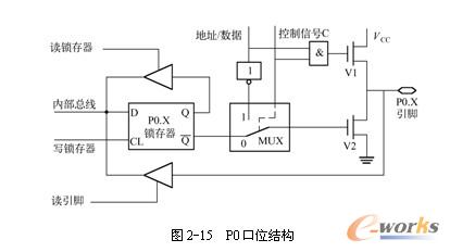 微处理器在执行输入指令时,首先低8位地址信息出现在地址/数据总线上,P0.X引脚的状态与地址/数据总线的地址信息相同。然后,微处理器自动地使转换开关MUX拨向锁存器,并向P0口写入FFH,同时“读引脚”信号有效,数据经缓冲器进入内部数据总线。