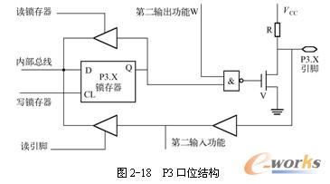 作为输入功能的口线(如RxD等),由于此时该位的锁存器和第二功能输出线均为1,场效应晶体管V截止。引脚信号经输入缓冲器(非三态门)进入单片机内部的第二功能输入线。