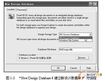 当用户启动Protel 99 SE后,系统将进入设计环境,此时可以单击File菜单上的New命令,系统将弹出如图1-3所示的Protel 99 SE建立新设计数据库的文件路径设置选项卡。