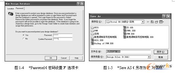 当用户选择“MS Access Database”类型后,如果想设定所设计的电路图数据库文件为保密级,则可以单击图1-3所示的对话框中的Password选项卡,进入密码设置选项卡,如图1-4所示,用户可以选择Yes单选按钮,并且可以在Password编辑框中输入所设置的密码,然后再在Confirm Password(确认密码)编辑框中输入设置的密码,确认正确后,即设置成功。