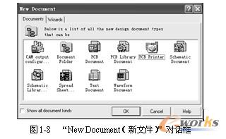 新建一个空白文件,文件的类型可以是原理图Sch文件、印制电路板(PCB)文件、原理图元器件库编辑文件(SchLib)、印制电路元器件库编辑文件(PCBLib)、文本文件以及其他的文件等。选取此菜单项后,将会显示新文件对话框,如图1-8所示,用户可以选择所需建立的文件类型,然后单击OK按钮即可。