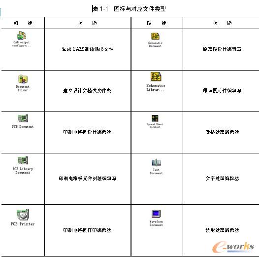 Protel 99 SE提供了丰富的编辑器资源,如图1-8中的图标所示,各图标所代表的文件类型见表1-1。