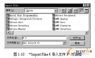 将其他文件导入到当前设计库,成为当前设计数据库中的一个文件,选取此菜单项后,将会显示导入文件对话框,如图1-10所示,用户可以选取所需要的任何文件,将此文件导入当前设计库中。