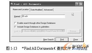 选择该命令后,系统将弹出如图1-13所示的查找文件对话框,用户可以查找设计数据库中或硬盘驱动器上的其他文件,用户可以设置各种不同的查找方式。