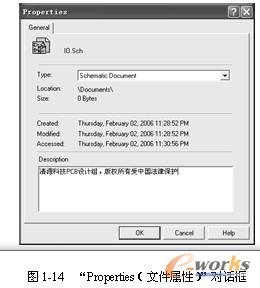 该命令表示管理当前设计库的属性。如果先选中一个文件对象,再执行该命令,则系统将弹出如图1-14所示的文件属性对话框,用户可以修改或设置文件属性和说明。