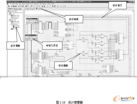 Protel 99 SE有一个强大的设计管理器,其界面如图1-18所示,包括导航、设计窗口、面板、标签、工具栏等。允许用户浏览和修改项目设计数据库。