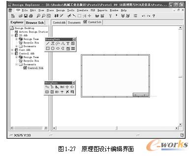 4)新建立的文件将包含在当前的设计数据库中,系统默认的文件名为“Sheet1”,用户可以在设计管理器中更改文件的文件名,更改文件名后显示在设计数据库中,如图1-26所示的Control.sch文件。单击此文件,系统将进入原理图编辑器,此时,与实现电路原理图设计绘制有关的工具菜单将全部显示出来,如图1-27所示。现在就可以进行图形的设计与绘制。