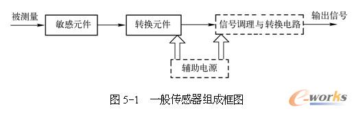 “传感器是能感受规定的被测量、并按照一定的规律将其转换成可用输出信号的器件或装置”(引自国家标准GB7665-87)。从广义上讲,传感器是获取和转换信息的装置。在某些领域中又称为敏感元件、检测器、转换器等。通常传感器由敏感元件和转换元件组成。其中,敏感元件是指传感器中能直接感受或响应被测 量的部分,而转换元件是指传感器中将敏感元件感受或响应的被测量转换成适于传输或测量的电 信号的部分。一般这些输出信号都很微弱,因此需要有信号调理与转换电路将其放大、调制等。 目前随着半导体技术的发展,传感器的信号调理与转换电路可以和敏感元件一起集成在同一芯片上。一般传感器组成框图如5-1所示。