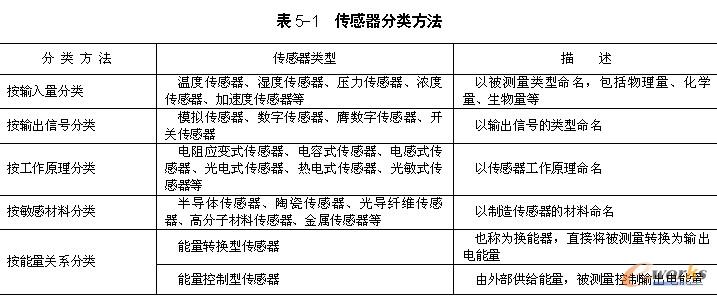 传感器种类繁多,可按不同的标准分类。按外界输入信号转换为电信号时采用的效应分类,可分为物理、化学和生物传感器;按输入量分类,可分为温度、湿度、压力、位移、速度、加速度、角速度、力、浓度、气体成分传感器等;按工作原理分类,可分为电容式、电阻式、电感式、压电式、热电式、光敏、光电传感器等。表5-1给出了常见的分类方法。