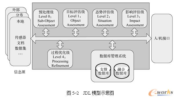 JDL在给出数据融合定义的同时,提出了一个数据融合的层次模型,即数据融合的JDL模型。图5-2给出了JDL模型的示意图,可以看到,在JDL模型中,数据融合可以分为5个不同的处理级别,预处理级(Level 0: Sub-Object Assessment)、目标评估级(Level 1: Object Assessment)、态势评估级(Level 2: Situation Assessment)、影响评估级(Level 3: Impact Assessment)和过程优化级(Level 4: Processing Refinement),一般认为,前两个处理级别属于数据融合的低级层次,以数值计算过程为主;后三个处理级别属于数据融合的高级层次,主要采用基于知识及知识推理的方法为主。