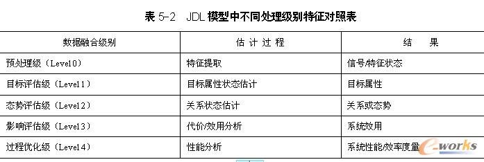 表5-2给出了数据融合的JDL模型中不同处理级别所需完成的估计过程及其结果的对照表,如态势评估级主要完成实体间关系状态的估计过程。