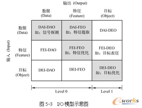 Dasarathy等人基于信息/数据融合过程的输入数据类型和输出数据类型的不同,提出了一个描述信息/数据融合的I/O功能模型,图5-3给出了一个简化的Dasarathy数据融合I/O模型。可以看到,模型中输入和输出分别对应着数据(Data)、特征(Feature)和目标(Object)3 种不同的类型,不同的输入类型和输出类型的组合则对应着不同的信息/数据融合过程类别。 Dasarathy等人对对角线及其附近位置(对应图中阴影部分)的信息/数据融合过程类别进行了描 述,如数据输入-数据输出类(DAI-DAO)、数据输入-特征输出类(DAI-FEO)、特征输入-特征 输出类(FEI-FEO)、特征输入-目标输出类(FEI-DEO)、目标输入-目标输出类(DEI-DEO)等。
