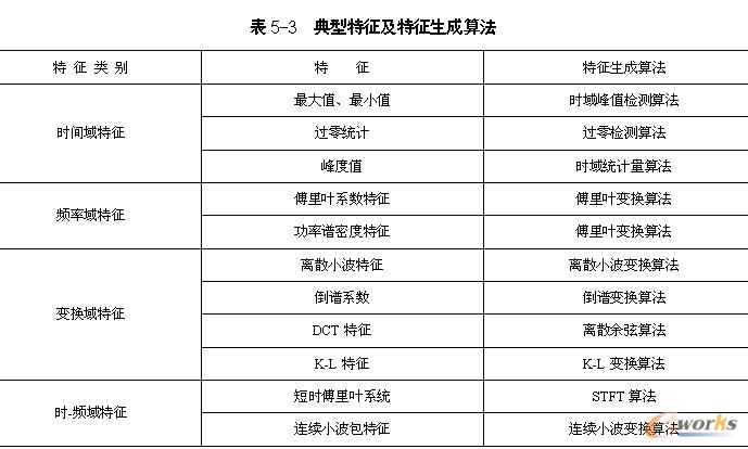 特征提取技术是通过提取表示某一特定模式结构或性质的特征,并采用一个特定的数据结构对其进行表示的过程。从概念上说,特征提取技术包括特征生成技术、特征选择技术和特征变换技术,其中特征选择和特征变换可实现特征维数的消减。表5-3给出了一些典型的特征及对应的特征生成算法。