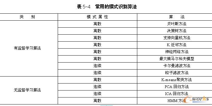 物联网应用系统的目标之一就是要实现对物理世界的全面透彻感知,因此,模式识别技术在物 联网感知互动层信息处理过程中具有不可缺少的重要作用。从方法学上看,模式识别可以分为基 于统计的模式识别方法和基于结构句法的模式识别方法。从算法实现上看,模式识别算法可以分 为有监督学习的方法和无监督学习的方法。表5-4给出了常用的模式识别算法。